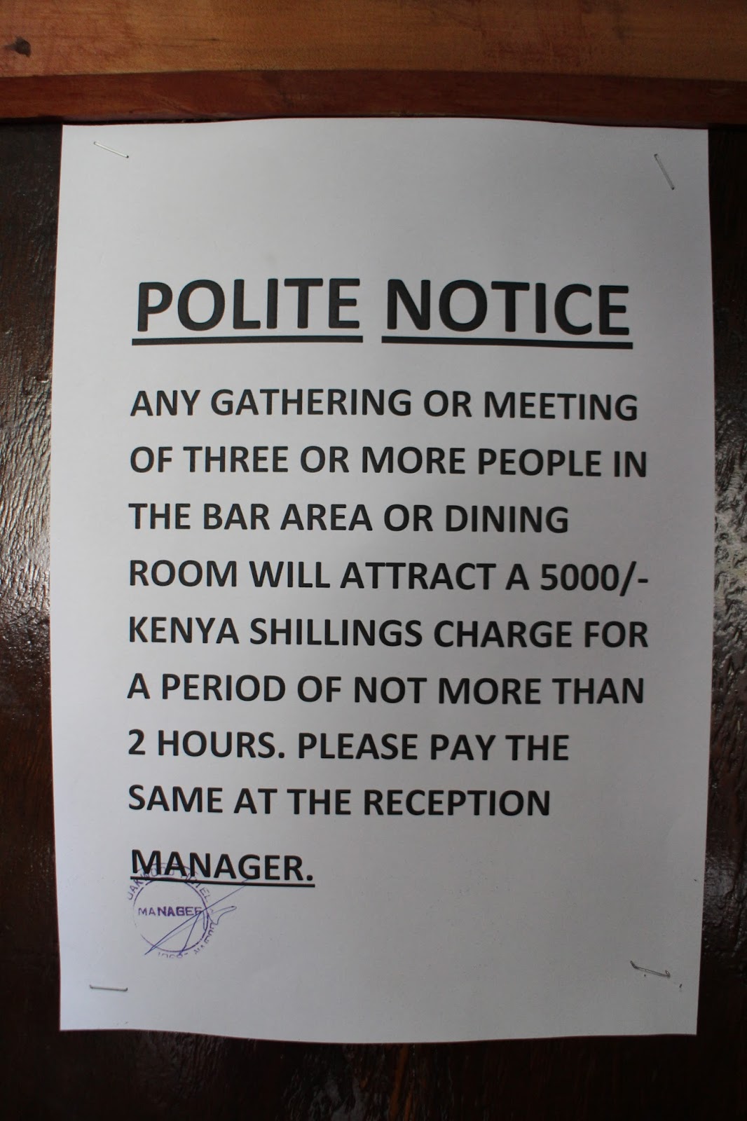 Jõudsin Nairobi, Keenia ja veetsin seal ühe ööpäeva. Suhteliselt mõttetu linn valgele inimesele. Suurt mitte midagi teha ega vaadata polnud. Kõik valged, kes riiki tulevad pidid otse lennujaamast safaritele siirduma. Oma öömajas söömas olles jäi huvitav kuulutus silma (5000 keenia šhillingit on 42€):